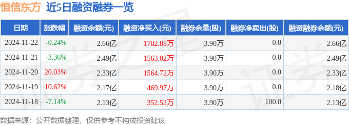 恒信东方融资融券信息显示,融资方面,当日融资买入1.29亿元,融资偿还1.12亿元,融资净买入1702.88万元,连续3日净买入累计4830.63万元。融券方面,融券卖出0.0股,融券偿还0.0股,融券余量3.9万股,融券余额32.45万元。融资融券余额2.66亿元。 近5日融资融券数据一览见下表: