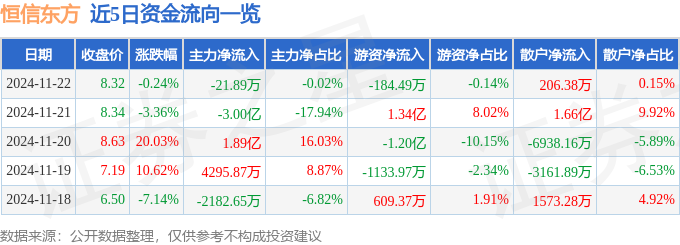 本站消息,截至2024年11月22日收盘,恒信东方(300081)报收于8.32元,下跌0.24%,换手率25.95%,成交量156.92万手,成交额13.6亿元。 11月22日的资金流向数据方面,主力资金净流出21.89万元,占总成交额0.02%,游资资金净流出184.49万元,占总成交额0.14%,散户资金净流入206.38万元,占总成交额0.15%。 近5日资金流向一览见下表: